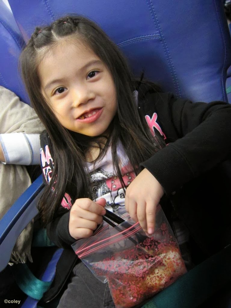 | Sofia's last meal was Katsu and Rice but I had to hurry her because it was boarding so I made her eat it on the plane out of a Hello Kitty ziplock bag. |